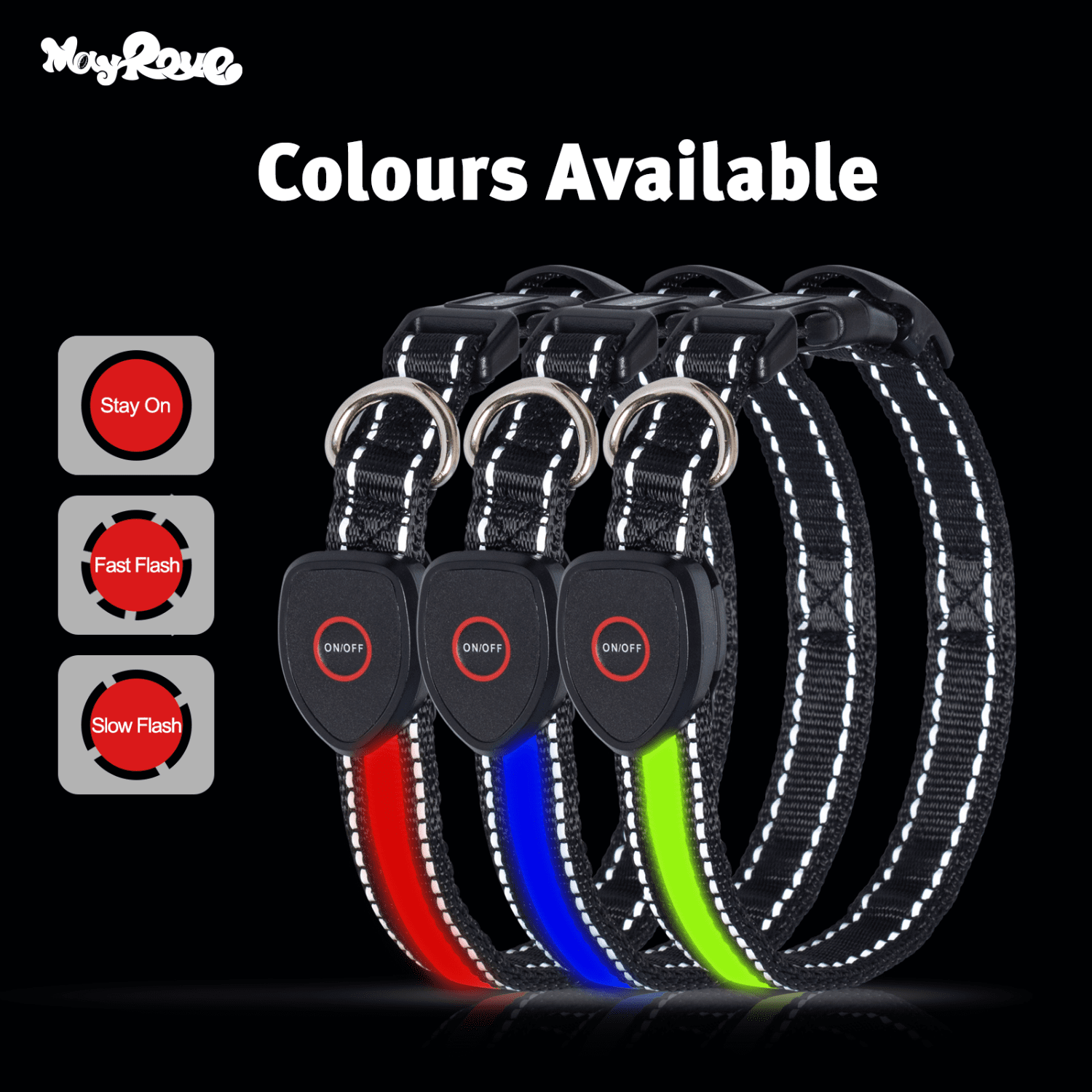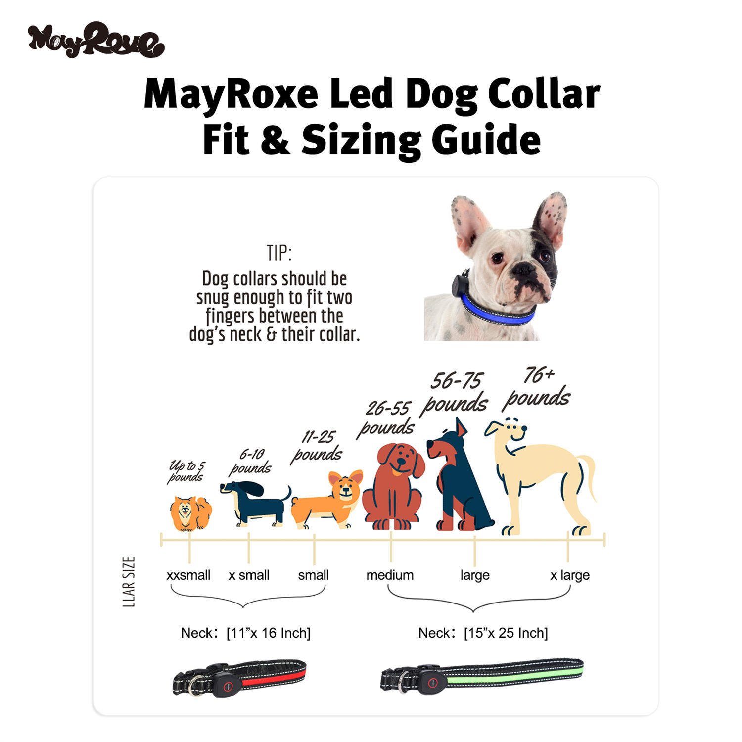 [Triple Safety] The MayRoxe led dog collar is made by nylon material which is very safe for your dog's skin; the reflective strips of the light up dog collars design on both sides can protect dogs even the light of led dog collar rechargeable is off; and the light up dog collars help vehicles see your dog well.